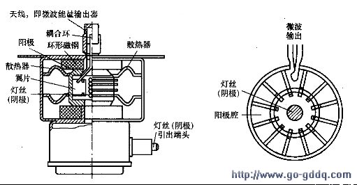 可见,磁控管是由阴极(灯丝)、阳极、环形磁钢、耦合环、天线(即微波能量输出器)、散热器和灯丝插头等组成。其中阳极呈圆筒状,通常用铜材制成,筒中多个翼片将阳极分割成十几个扇形空间,每个扇形空间就是一个阳极谐振腔,其谐振即磁控管的工作频率,一般为2450M左右。在阳极的外壳嵌套了一对环形永久磁钢,磁钢形成的磁场用于控制阳极腔内的微波振荡能量。阳极输出的微波能量通过一根环状金属管(即耦合环)传送到天线,再由天线向炉内发送微波能,对食物进行加热。