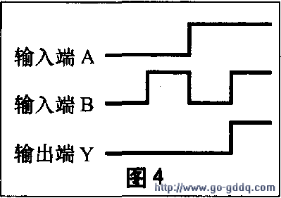 实现与逻辑关系的门电路叫做与门电路。图3为2输入端与门逻辑符 号,方框中符号&表示与逻辑关系,左边两条横线表示两个输入端A、B,右边的一条横线表示输出端Y。