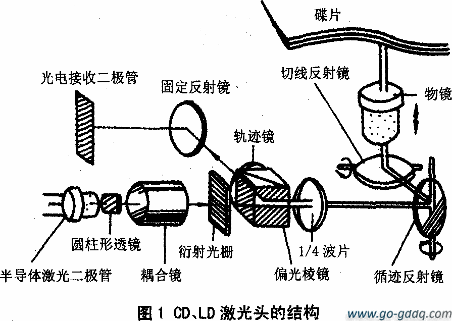 组成。由于半导体激光二极管的谐振腔较短,产生的激光发散角较大,需由透镜准直成平行光,再射向衍射光栅。激光通过衍射光栅后发生衍射,使入射的激光束分裂成彼此以一定间隔分离的光束,其中中间的称为O级条纹的光束最明亮,它的传输沿着原光轴方向前进。除了0级衍射光束外,在其两侧尚有±1级、±2级……等很多衍射光束,在拾信头中仅利用0级光束来读取盘片上记录的信号和检出对焦伺服系统误差信号。由于衍射光栅和物镜的共同作用,使投射到盘片的激光束只有1 μ m左右大小。激光头中的四分之一波片的作用是使激光束的偏振角度发生旋转,以保证经盘片反射后的激光通过偏光棱镜后射向光电接收二极管,而不返回激光二极管。
