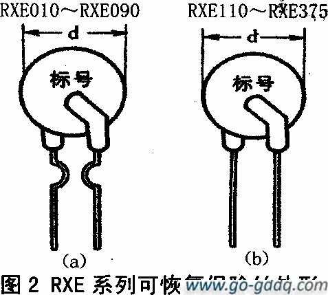 可恢复保险丝——Poly switch(聚合开关)是一种高分子的过流保护元件。其中RXE系列产品的外形如图2所示。直径有:7.4 mm、7.9mm、11.7mm、13.0 mm等多种尺寸。