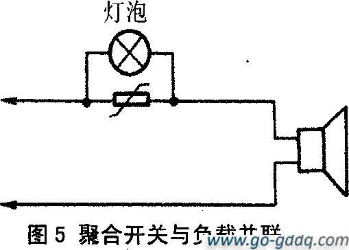 图4是个采用聚合开关做过流保护的例子,聚合开关与串联。当驱动电压升高,聚合开关阻抗随之增大,使输出功率下降;当驱动电压降低,输出功率增大,聚合开关不再有足够功率来维持断开状态,就自动恢复 了;另一种方法是:用聚合开关与灯泡并联来进行保护,如图5所示。