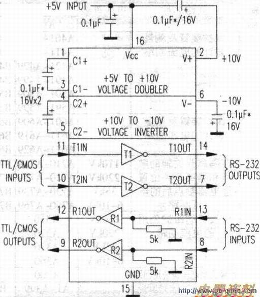 电容型开关电源的典型代表是用于串口通讯的RS232收发器。如下图中的MAX202所示。RS232通讯需要将5V的电源电压通过倍压和反向生成±1OV电源。以产生通讯需要的信号。