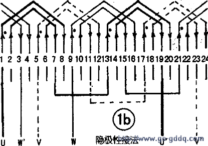 下图为24槽4极电动机绕组展开图。下图a为显极性接法。线圈节距为l-6.单层交叉式,绕组的个数等于磁极数。每相有4个单绕组。绕组的接线方式为头接头,尾接尾。图1b为隐极性接法,线圈节距为l-8,2-7.为同心式绕组。每相有2个绕组。为磁极数的1/2,接线方式采用尾接头。