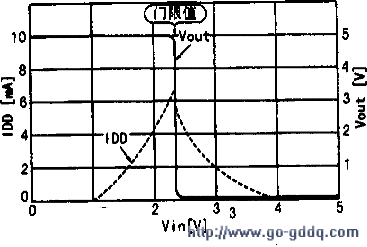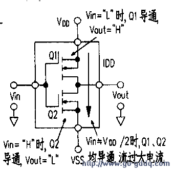 上图是标准化的数字IC输出级。不论是在“H”或“L”状态,总有一个输出管(Q1或Q2)处于关断状态。但如果输入Vin处于门限值1/2VDD)附近,就可能出现Q1和Q2都导通的状态,这时在IC中将流过较大的而发热。中图是数字IC输入电压和输出电流的关系。