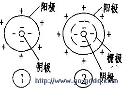 在二极管的两个电极之间插入一个栅栏状的电极就构成三极管(如图2所示)。这个栅栏状的电极叫做控制栅极,简称栅极,用符号G(grid)表示。结构一般是用镍锰合金丝在支撑物上绕成螺旋形,每圈之间有一定的距离,以便从阴极发射出来的电子能通过这些空隙流到屏极。