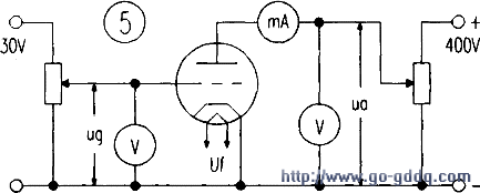 屏极特性曲线是将栅压ug固定在某一数值时,屏流ia与屏压ua之间的变化关系曲线。不同的栅压可以得到不同的特性曲线。许多条这样的曲线就组成了屏极特性的曲线簇。测量屏极特性曲线簇的电路见图5。