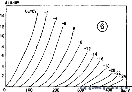 先把栅压ug调整在OV,然后把屏压u。从零开始逐渐升高,每改变一次屏压就得到一个相应的屏流数值,就可在坐标图上确定一个点,把许多点连接起来就得到一条曲线。然后逐渐调低栅压。用上述调整屏压的方法,量得不同栅压时的屏极特性曲线,依此类推,就可以得到三极管的屏极特性曲线簇。图6是三极管6N8P的屏极特性曲线簇。