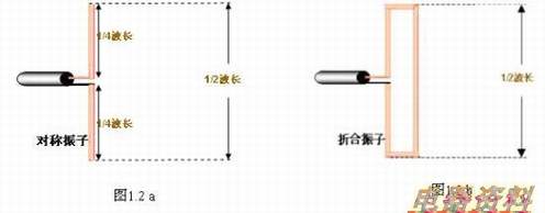 每臂长度为四分之一波长、全长为二分之一波长的振子,称半波对称振子, 见 图1.2 a 。 另外,还有一种异型半波对称振子,可看成是将全波对称振子折合成一个窄长的矩形框,并把全波对称振子的两个端点相叠,这个窄长的矩形框称为折合振子,注意,折合振子的长度也是为二分之一波长,故称为半波折合振子, 见 图1.2 b 。