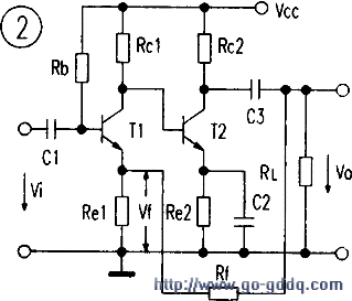 图2是一个两级直接耦合放大电路。在这个电路里,由于Rf跨接在输出端与晶体管Tl的发射极之间,因此输出电压Vo的一部分能够通过Rf加在Re上,从而构成了反馈,利用瞬时极性法进行分析如下: