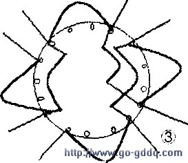 3.画出主绕组内线圈元件间的接线图。极相内的线圈采用“首接首,尾接尾”的显极反串法(如图3)。