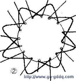 1.画出主绕组两个线圈元件和副绕组两个线圈元件的嵌入线图。按逆时针顺序,嵌入线的规律为“嵌1空l”,主、副绕组线圈的跨距均为l跨4(如图1)。