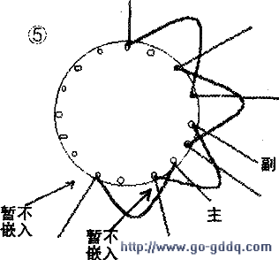 (4)向右数空1槽,把副绕组的第2个线圈中带引接线的线圈边嵌入槽内,再按跨距l跨4嵌入上层边(如图5)。