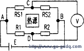 将作为热源的加热器,设置在流量传感器管道中间。使被测气体温度升高。在加热器两端各放置一个测温热敏,用以检测加热器两端气体温度的变化。这两个热敏(RSl、RS2)与两个固定组成电桥(见附图)。