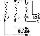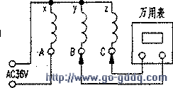 该方法只需1只,输出为36V的工频1只。将电动机每相的一端连接成“Y”形,把36V交流电输入其中一相,用电压挡测量其余两相的出线(如左图所示)。记下有无读数。然后换接成右图的接法,再记下有无读数,最后根据下述情况判断。