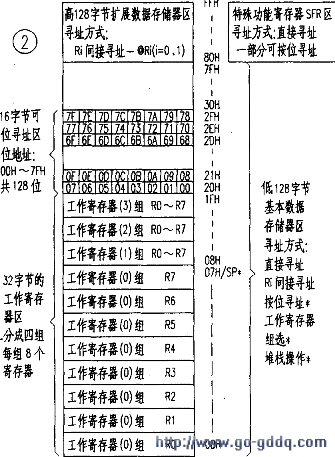 1)工作寄存器区 从地址00H~lFH的32个工作寄存器分成O~3四组,每组8个寄存器。工乍寄存器的组选由SFR的程序状态字PSW的RSI和RS0位决定。RSl、RS0为00、01、10、11,分别选工作寄存器的0组、1组、2组、3组。
