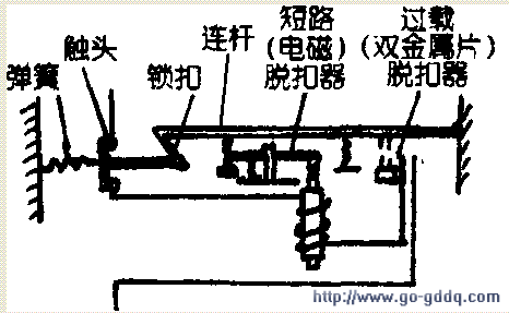 断路器有三个基本组成部分:触头和灭弧系统、脱扣器、传动和操作机构,其工作原理可用附图示意图来说明。附图中所示的触头闭合,锁扣将此合闸状态用搭勾锁定使其稳定。发生过载时,过载脱扣器动作,小倍数过载电流经过一定长的时间使双金属片弯曲到一定程度,这时其一端的螺钉(可调)向上推动连杆使之脱扣造成失稳,触头得以分离,从而实现过载延时保护。发生短路时,短路脱扣器动作,大倍数短路电流通过电磁铁产生的磁力迅速吸引衔铁使之向下运动,安装在另一端的螺钉(可调)向上推动连杆,使之脱扣造成失稳,触头迅速分离,从而实现瞬时短路保护。