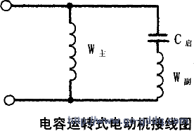 器与副绕组串联后再与主绕组并联。工作中电容器、副绕组与主绕组共同运转不断开,称为电容运转电动机。电容运转电动机利用绕组抽头、自耦来调速。主要用于抽风机、吊扇、电风扇等电器中。其接线图见图所示。