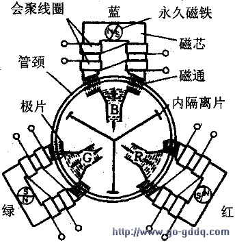 会聚校正,包括静会聚和动会聚两部分,其径向会聚组件如左图所示(背视图)。静会聚是指电子束在不受任何偏转时,三电子束应会聚在荫罩板中心小孔处,并且各自打在相应的荧光粉点上。三电子枪在装配时,对正三角形的中心轴线有一定的倾斜度,通常为1度左右。