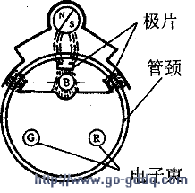 这就使得三电子束大体上会聚在荫罩板的中心处。但是,在制造和安装过程中,难兔有一定误差,所以需要用永久磁铁来调节磁场的强度,使屏幕中心区域实现更好的会聚。在永久磁铁磁场的作用下,使三电子束作与磁力线相垂直的偏移,以调节三电子束沿径向运动的轨迹。左图中用箭头表示出三电子束沿径向的偏移方向。在安装三电子枪时,其位置也难兔有些误差,所以电子束仅能沿着径向偏移还不够,很可能出现某电子束在水平切线方向打偏的情况。为此至少要有一束电子能沿着切线方向调整才行。通常是校正蓝电子枪,使蓝电子束相对于红、绿、电子束作水平切线方向移动,达到三射束会聚的目的。蓝束切向偏转机构磁力线的分布情况及蓝电子束运动的方向如右下图所示。在调节蓝束切向偏转机构时,很容易使电子束聚焦恶化,因此应同时调整电子枪的聚焦电压。