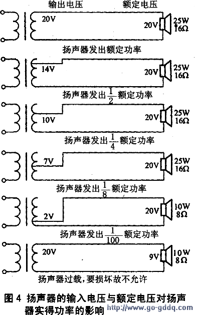 例如:已知25 W/16Ω的扬声器,它的额定工作电压为20 V。在考虑实际配接时,扬声器可根据它的额定工作电压和扩音机(或输送变压器)输出电压相符的原则,去找出扬声器应该接到那个抽头上,以保证扬声器正常工作。只要扬声器承受的工作电压不大于它本身的额定电压,不会损坏。若线间变压器输出电压小,扬声器的实得功率也就小,如图4所示。