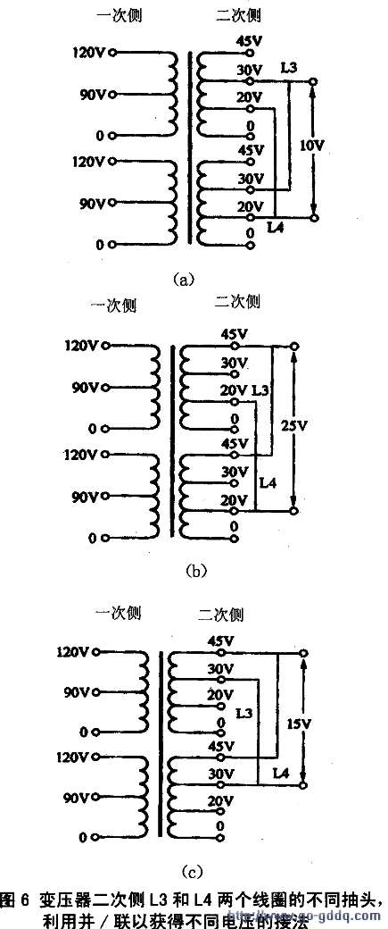 对于变压器的二次侧也可用并联方法接成20 V、30 V和45 V,在特殊的情况下,还可从20~30 V,20~45 V或30~45 V端子上获得10 V、15 V或25 V三种输出电压,如图6所示。