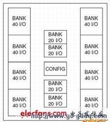 目前的 FPGA 可支持许多种 I/O 标准,因而为您的系统提供了理想的接口桥接。FPGA 内的 I/O 按 bank 分组 (见下图) ,每个 bank 能独立支持不同的 I/O 标准。 目前最先进的 FPGA 提供了十多个 I/O bank,能够提供灵活的 I/O 支持。