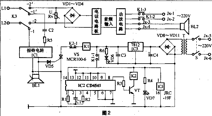 L1、L2接一路内部电话线,JX为小盒与外部接线端子板Jx-1、Jx-2接入交流220V市电,为功放器提供,Jx-3、Jx-4是低频功放输出端,外接高音扬声器BL2,Jx-5、Jx-6接交流,S为电源开关,T为12V小功率电源。VD8~VD11为桥式(可选用1N4004),C3、C4为电源,可选用25V/470μF,3为12V三端稳压器7812,R6阻值为1.2kΩ,VD6为用作电源指示灯。K1、K2为中型直流电磁,型号可选TX-3C(+12V线包),K3是小型直流继电器,型号为JRC-19F。将电话机的舌簧开关拆掉,将JRC-19F装上焊好即可,大小正合适,要分清常闭接点、常开接点,以防接错位置。IC2为定时CD4541,用作延时电路,CD4541的各脚功能是:1、2、3脚为内部,R1、C1、R2为IC定时电路外接元器件。R1先接1MΩ电位器,根据定时时间最后确定阻值,然后用固