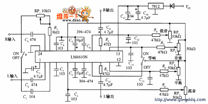 下面介绍由 LM4610N 构成的高品质音调均衡 。LM4610N是用直流控制音调、音量和声道平衡 的集成 ,具有3D音场处理功能和等响度补偿功能。LM4610N广泛应用于家庭影院和组合音响等 的均衡电路中。