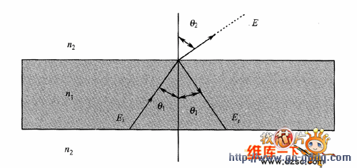首先考虑在折射率为n1的媒质中传输的一束光(Ei),以入射角0,入射到两种媒质的界面上,如图1所示。光在界面上一部分被传输(Et),另一部分被反射(Er)。由菲涅耳定律可得出折射率n1、n2与入射角θ1、折射角θ2之间的关系为