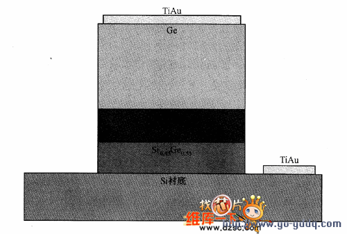 利用SiGe作为应变缓冲层,将Go生长在缓冲层上的探测器结构也被提出卩剐,如图2所示。在51衬底上分别生长0.6 gm的510 456e.55层和0.4pm的510 5560.45层,接着在400C下用超高真空化学气相淀积法生长2.5gm锗层。在生长每层缓冲层后进行15min、750°C退火能进一步降低位错密度[79~80]台阶形状结构可以通过标准光刻、刻蚀、淀积金属得到,最后生长一层200 nm 5102 钝化层以减小表面暗电流。对于直径为24 gm的异质结探测器,在IV、3V、10V反向偏压下暗电流分别为0.06 pA、0.27 pA、1.07 pA。随着直径的增大暗电流还将继续增大,当直径为100 ptm时在4V反向偏压下暗电流达到了10 pA,虽然暗电流密度比在硅上直接生长锗要小,但暗电流还较大不够理想。镀上抗 反射膜 (ARC)之后,在1.3 ptm波长下测得的响应度分别为:0.31 A/W(0 V偏压)和0.51 A/W(2V反向偏压)。网络 分析仪 测得的带宽为:4.0 GHz(-3V)、6.0 GHz(-5V)、7.8 GHz(-1V)和8.1 GHz(-10V)。