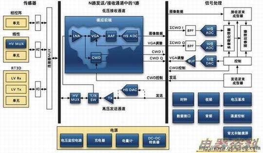 超声成像通道的接收机用于检测二维(2D)信号以及彩超流体成像所需的脉冲多普勒(PWD)信号和频谱PWD。接收机包括Tx/Rx开关、低放大器(LNA)、可变增益放大器(VGA)、抗混叠 (AAF)和模/数转换器(ADC)。