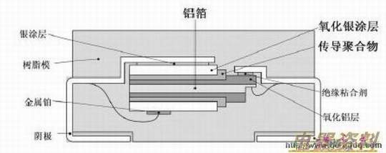 固态铝聚合物 贴片电容 则是结合了铝电解电容和 钽电容 的特点而形成的一种独特结构。同液态铝电解电容一样,固态铝聚合物多采用贴片形式。高导电率的聚合物电极薄膜沉积在氧化铝上,作为阴极,炭和银为阴极的引出电极,这一点与固态钽电解电容结构相似(图3)。