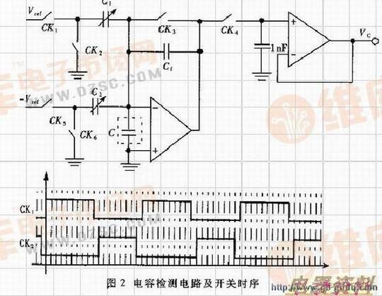 其基本原理是利用电容的充放电将未知电容变化转换为输出。该测量电路包括一个电荷 放大器 、一个采样保持电路,如图1所示;以及 控制开关 的时序,如图2所示。