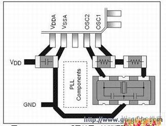 图2和图3给出了这种设计的一个实例,其中显示的是用于 MC68HC908 ?C的振荡电路。图2为推荐电路,三端陶瓷谐振器。