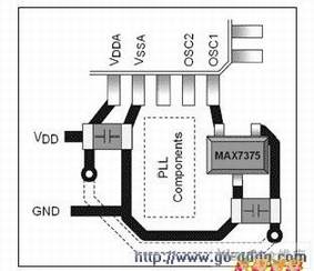 硅振荡器在电路板上的布局通常没有很高的要求,因为这种器件输出的是低阻抗方波,它能够在电路板上传送足够的距离,且无须顾虑其他信号对它的干扰。硅振荡器能够驱动多个器件。和任何其他高速信号一样,硅振荡器的时钟输出在驱动长 导线 时会产生电磁辐射。靠近时钟 发生器 的引脚,在每路时钟信号上串连一个电阻可以降低这种辐射。如图4所示,MAX7375驱动两路时钟电路时,每条时钟线上都串入了一个电阻。