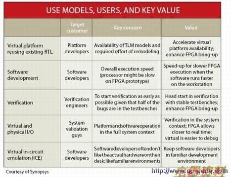 据Synopsys的系统级 解决方案 产品营销总监Frank Schirrmeister介绍,当谈及TLM时,至少有五种使用模型已成主流(见下表)。排在列表首位的是复用的情况。