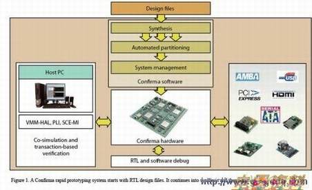 对Confirma快速原型系统(图1)中组件的一种高级概述是从贯穿综合始终的RTL设计文件开始。接着在快速原型板上对设计进行分割。系统的Confirma软件执行这一分割过程,而且该软件明白其目标是一块HAPS板。然后,用户就可以进行模拟原型所需的接口实例化,以及协同仿真和基于事务的验证所需的将设计链接到其它环境中。