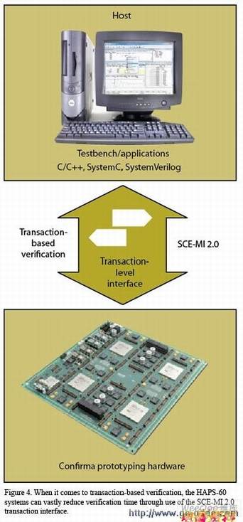 当涉及基于事务的验证时,通过使用SCE-MI 2.0事务接口(图4),HAPS-60系统可以大大缩短验证时间。“这正是开发SCE-MI 2.0的目的,”Amos说。“SCE-MI接口使我们能用软件进行事务处理,将事务传递到硬件,以及硬件再生成事务。该技术被用在 仿真器 类型的环境中来模仿真实世界的做法。”