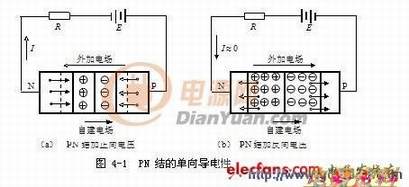 在一块半导体基片上通过适当的半导体工艺技术可以形成P型半导体和N型半导体的交接面,称为PN结。 PN结具有单向导电性:当PN结加正向时,P端电位高于N端,PN结变窄,由多子形成的电流可以由P区向N区流通,见图4-1 (a),而当PN结加反向电压时,N端电位高于P端,PN结变宽,由少子形成的电流极小,视为截止(不导通),见图4-1 (b)。