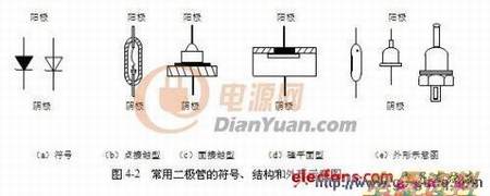 图4-2是常用二极管的符号、结构及外形的示意图。二极管的符号如图4-2(a)所示。箭头表示正向电流的方向。一般在二极管的管壳表面标有这个符号或色点、色圈来表示二极管的极性,左边实心箭头的符号是工程上常用的符号,右边的符号为新规定的符号。从工艺结构来看,点接触型二极管(一般为锗管)如图4-2(b)其特点是结面积小,因此结小,允许通过的电流也小,适用高频电路的检波或小电流的整流,也可用作数字电路里的开关元件;面接触型二极管(一般为硅管)如图4-2(c)其特点是结面积大,结大,允许通过的电流较大,适用于低频整流;硅平面型二极管如图4-2(d),结面积大的可用于大功率整流,结面积小的,适用于脉冲数字电路作开关管。