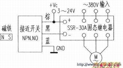 霍尔接近开关的输出极性和感应式原理基本一样。实际应用电路见下图所示。