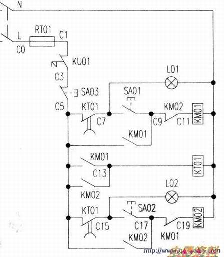 下图中。时间继电器用来调整电机自由停车时间。当停止时,正转接触器KM01断开,相应时间继电器Kt01也断开(要选用断电延时型的时间继电器。如JS14A—D)。这时,如再揿反转启动按钮。因为时间继电器Kt01的触点没有闭合。所以揿反转启动按钮不起作用。同理,要再回到正转状态,先揿停止按钮SA03,等待信号指示灯LD1亮时。揿正转启动按钮,正转接触器KM01闭合,电机才能正转启动运行。