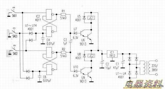 右图电路中。集成块2一CD4011构成两个简单的RS。晶体三极管U6(由两只9013构成达林顿)、R1、继电器JC1等组成了电机正转输出电路。同样。对称的组成了电机反转输出电路。正转、反转分别控制。电路接通后,两个RS触发器的复位端。接有C4.完成上电自复位。两个触发器的Q端均无输出。电路处于等待阶段。