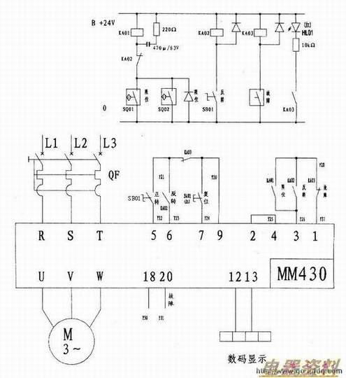 一个辊道变频装置运行,如图所示,主回路三进三出,三根线到电机。固定给定值,正反控制命令,数码显示。其他缓启动、保护功能等由程序设定实现。