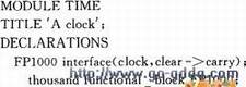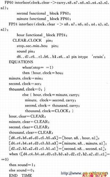 下面用ABEL语言的层次结构实现电子钟的设计可分为顶层模块Ck,3个底层模块1000,FP60和FP24。下面介绍顶层模块CLOCK,其中调用了3个底层模块。