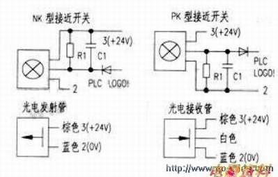接近开关的具体接线图见下图。西门子S7-300变频器的信号接收4~10v的,所以接近开关用直流24v的PK型。输出近+20V的高电乎,而没有分压,是因为S7-300输入端能够承受32V以下的,只用R1、C1降低灵敏度和增加抗干扰。作信号指向和隔离,所以可以直接接到PLC的端子上,省掉小继电器的转接。如果采用图3中的小继电器,则可用NK型接近开关。