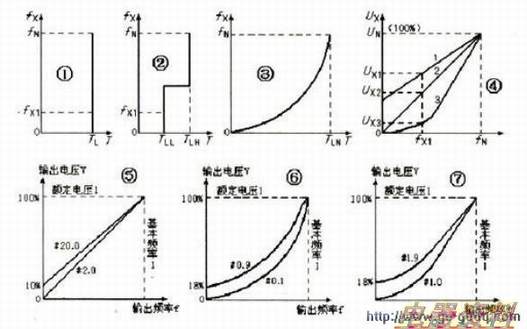 图5为恒转矩特性,图6为二次方律递减转矩特性,图7为二次方律递减转矩和恒转矩特性两者之间的比例转矩特性。从各种转矩U/f线的示意图可见。图7下部(低频区)的曲线陡度介于图5和图6相应部位之间,即比图6低频区更陡,而较图5低频区平缓些。图中“#2.O”标注的U/f线,是将参数F09设置为2.0时的曲线,其他前缀为“#”号的数字,含义与此相同。