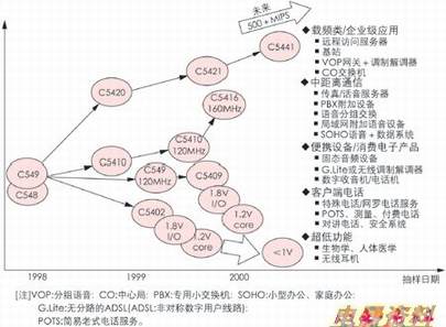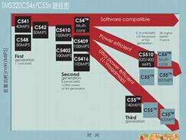 图1 TMS320C5000性能发展状况及应用领域 TMS320系列的同一代芯片具有相同的CPU结构,但根据市场的不同需要,形成新的与外设的不同组合,产生了多种派生器件。