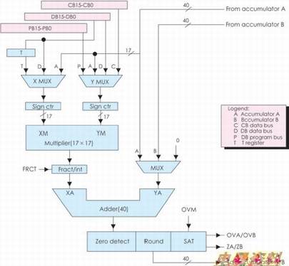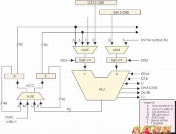 中央处理单元(CPU) ALU:算术逻辑运算单元 主要由40位ALU和两个40位累加器(AA和ACCB)组成,如图4所示。ALU和两个累加器用来完成40位补码的算术运算,也能完成布尔运算。当状态寄存储器ST1的C16位置1时,可做两个16位ALU,同时完成两个16位运算。输入: 16位立即数; 来自数据存储器的16位数; 来自暂存器T的16位数; 来自数据存储器读出的两个16位数; 来自数据存储器读出的一个32位数; 来自累加器(A和B)的40位数;