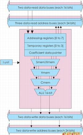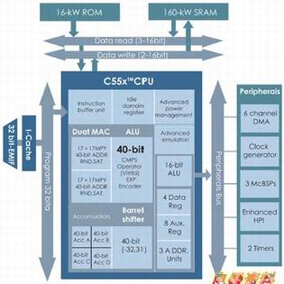 超低功耗设计: 在硬件结构中采用双MAC,有4个40bit的累加器,因而在一个周期内可完成更多的任务。 有更多的"自动并行"指令。为发挥附加的硬件功能,有的指令隐含或装有并行化的能力;另一些指令通过\'C55x DSP核的最佳汇编器和C编译器自动安排成并行运行。 用户可自行编程达到并行操作,以便充分利用\'C55x DSP芯片的性能。 附加新的指令,扩展硬件处理能力。例如双16位的算术运算、双MAC、条件移位、条件加或减、比例并选择极值、偶或奇对称的FIR滤波、并行移位和存储、寄存器比较或交换等一系列新的指令。 先进的高级功率管理能力。其一是自动断电能力,\'C55x DSP核连续的对内存、外设和核心功能单元进行监视,自动的对不工作单元断电;其二是用户可以自己配置IDLE休闲域,\'C55x有64种休闲方式,通过改变休闲域寄存器对应的状态位就可以改变对应部件的通断。 通过增加硬件和操作的并行性,极大的提高了处理器的处理能力。 可变指令长度增加代码密度:指令长度为8/16/24/40/48 bit,选择不同长度可使编码密度达到最佳和有效地利用总线;指令预取由16 bit增加到32 bit;片上指令缓存单元自动的不包装指令,以便最有效地利用每一周期。 附加总线和扩充地址增加数据流量:\'C55x有一组程序总线,3组读总线,2组写总线,每组总线中的地址线有24 bit,因而极大的扩充了寻址能力。 外部存储器接口性能比\'C54x有很大提高:采用双字宽(32 bit)及高速低价格同步存储器,使存储器操作与CPU操作具有相同的速率。同时有自动断电功能,只在使用时接通。 指令高速缓存减少外部存储器访问:\'C55x是第一个采用指令高速缓存的器件,允许几条指令同时加载到高速缓存器中,CPU不必对每条指令都去访问存储器,并且在时钟速率下利用指令,增加速度,降低功耗。 改进的控制代码,改善了控制代码的密度:\'C55x 增加了几个控制代码的附件,包括新的指令缓存单元、数据存储器和ALU。对条件执行的两种可能性都有准备,使得一旦条件出现,DSP立即响应。
